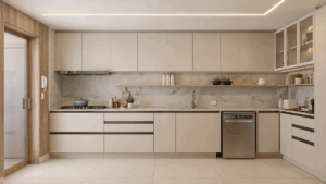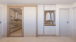 A copa pode ser integrada por uma porta de correr em madeira natural freijó, unindo estética e funcionalidade.