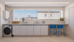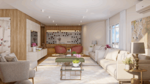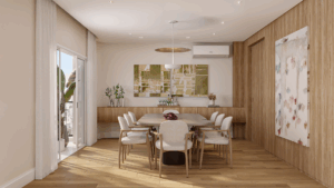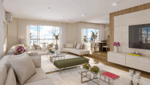 O living revela amplitude e fluidez, com quatro ambientes integrados e convidativos. Há espaço com possibilidade para criar um lounge ou uma adega, tudo pensado para receber com charme e viver com prazer.