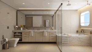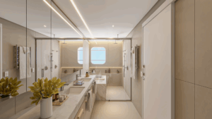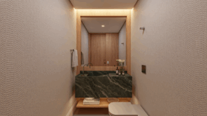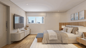 Na ala íntima, a suíte master surpreende: janelas acústicas, luz suave, walk-in closet com ilha central e um banho spa com jacuzzi